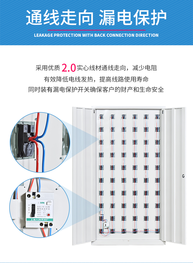 充電柜配備:2.5mm2實(shí)心線材,漏電保護(hù)器,小門內(nèi)配86型五孔插座(插座可選裝五孔+usb插座、多功能插座)